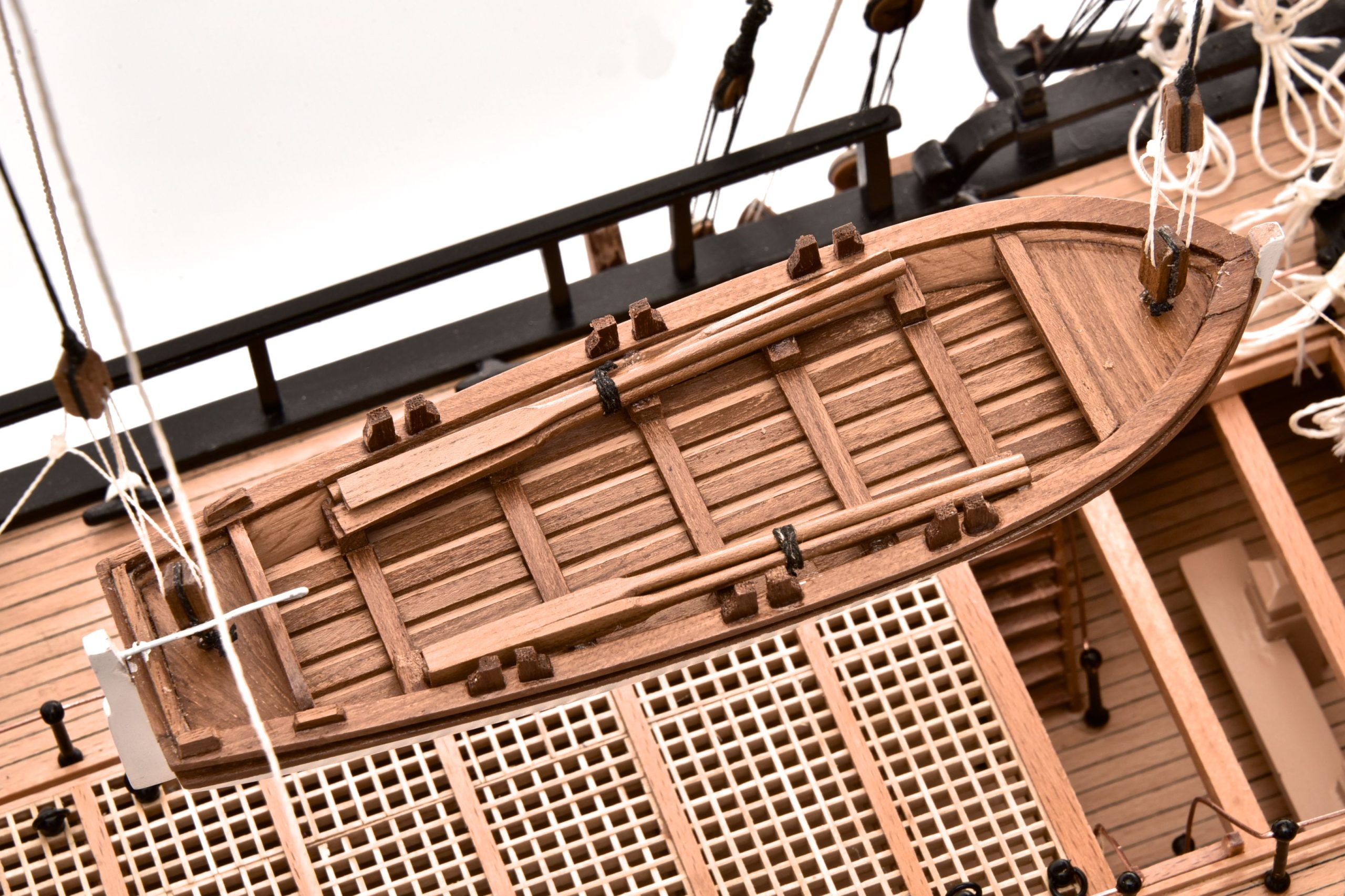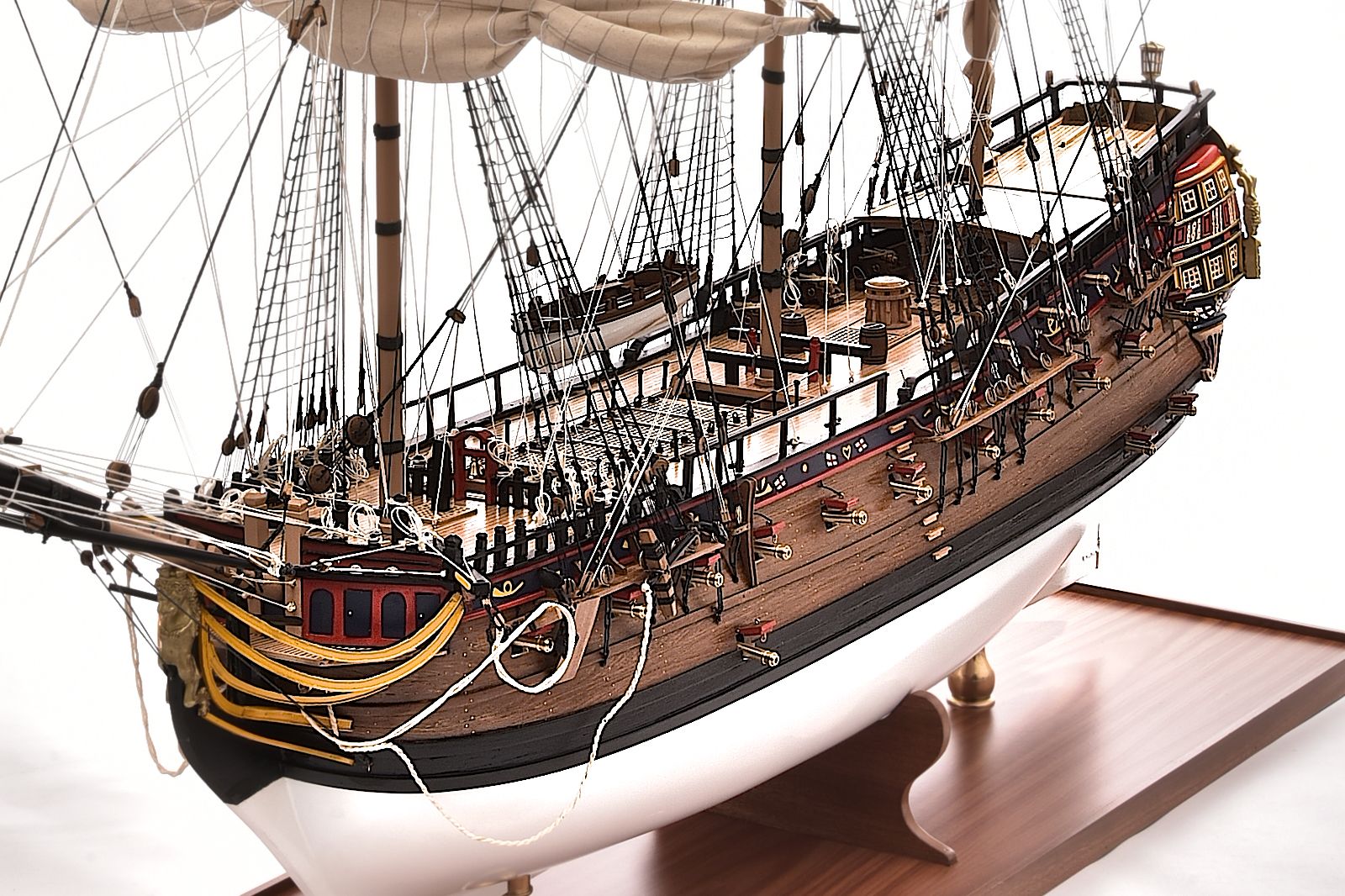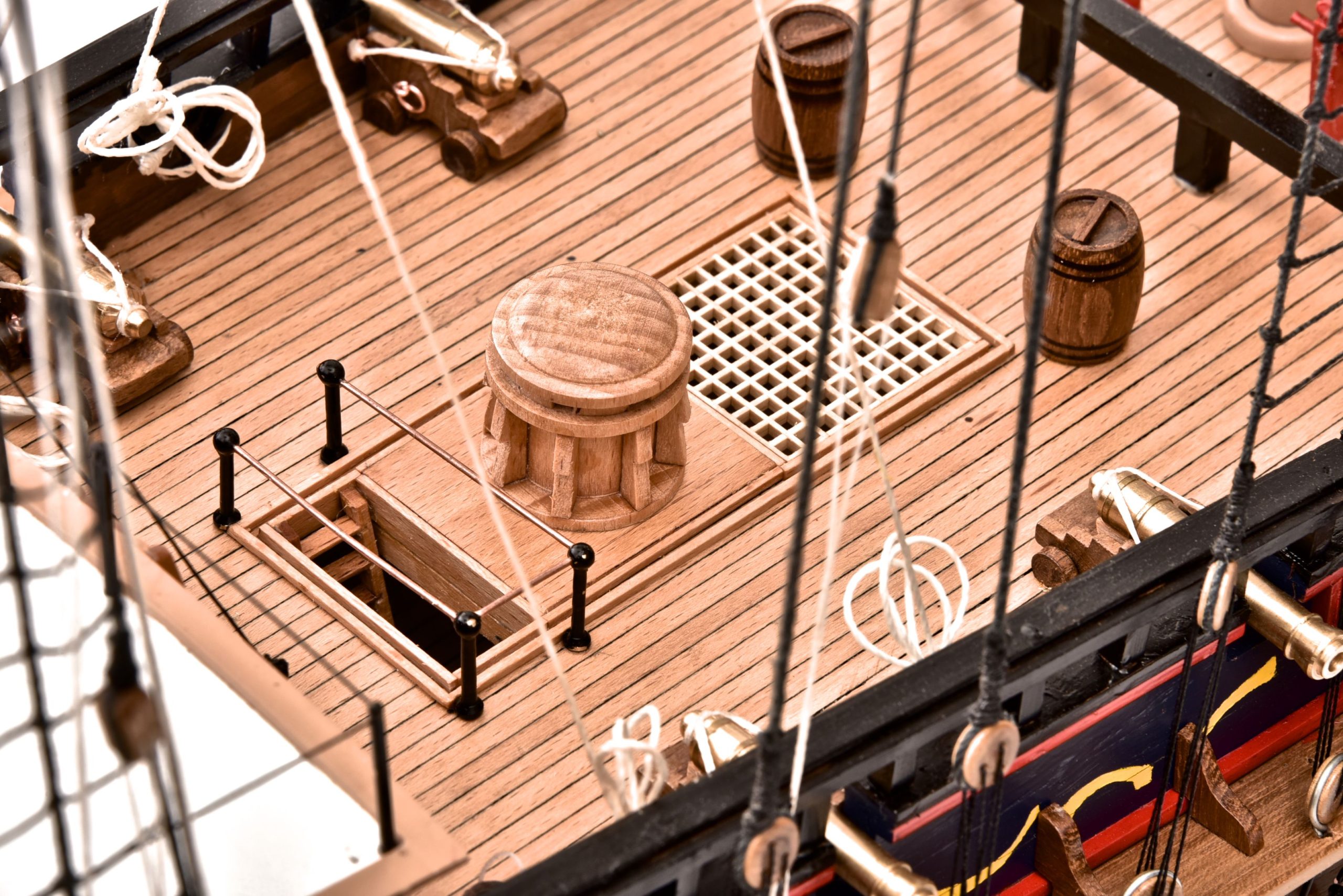 The British East Indiaman ‘Falmouth’ Open Hull Model Ship is constructed by our Workshop in Mauritius by our expert model makers. The model is predominantly made of wood with details made of good quality materials. The model features a cutaway section of the hull to display the interior of the ship on its port side. This model East Indiaman is intended to be a static model for display purposes.