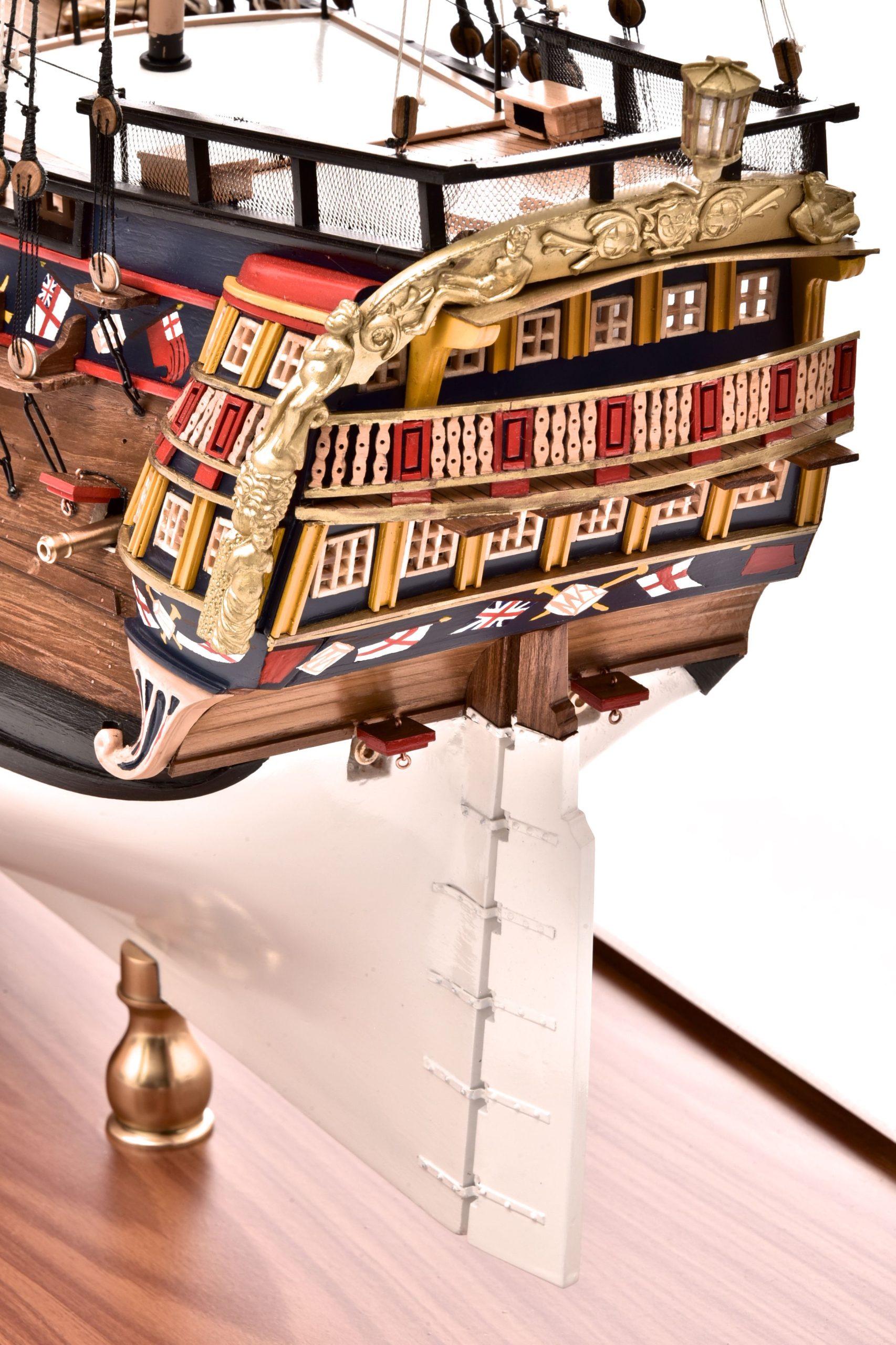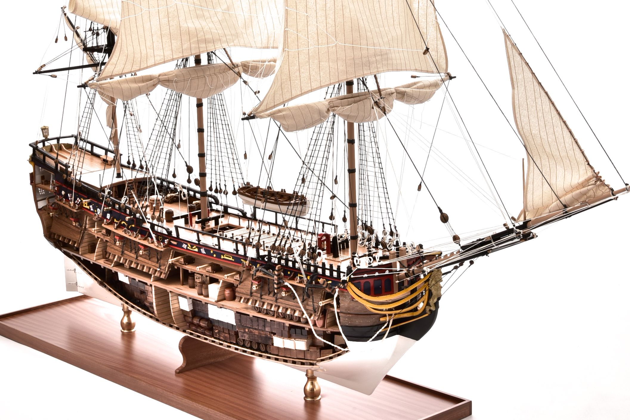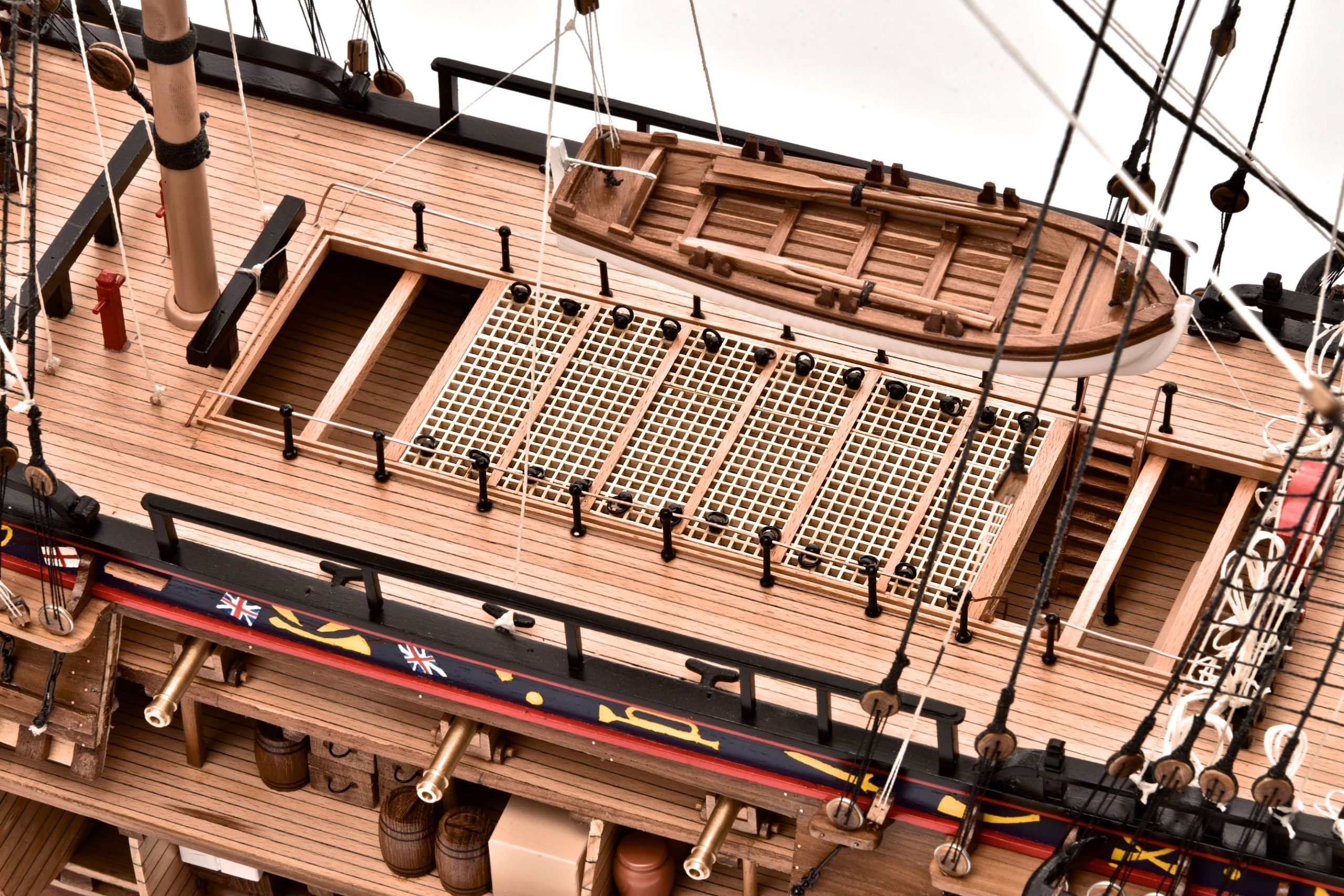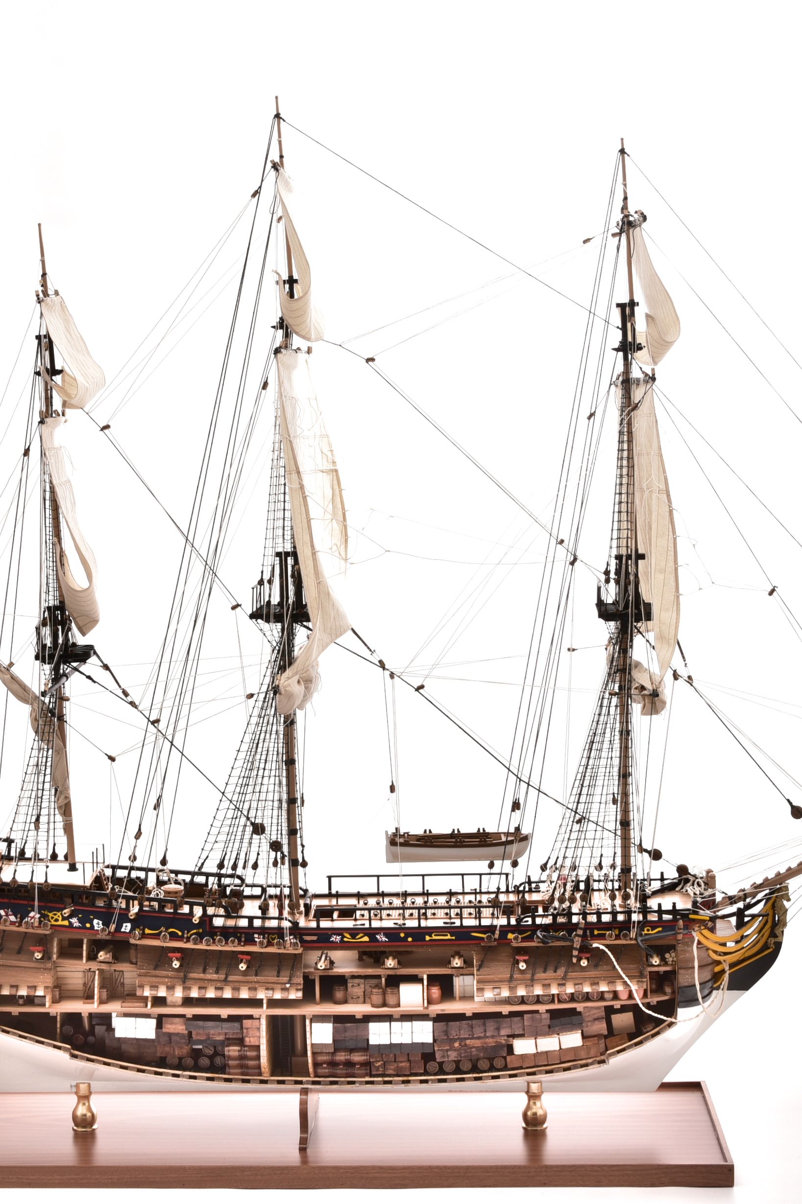 The British East Indiaman ‘Falmouth’ Open Hull Model Ship is constructed by our Workshop in Mauritius by our expert model makers. The model is predominantly made of wood with details made of good quality materials. The model features a cutaway section of the hull to display the interior of the ship on its port side. This model East Indiaman is intended to be a static model for display purposes.