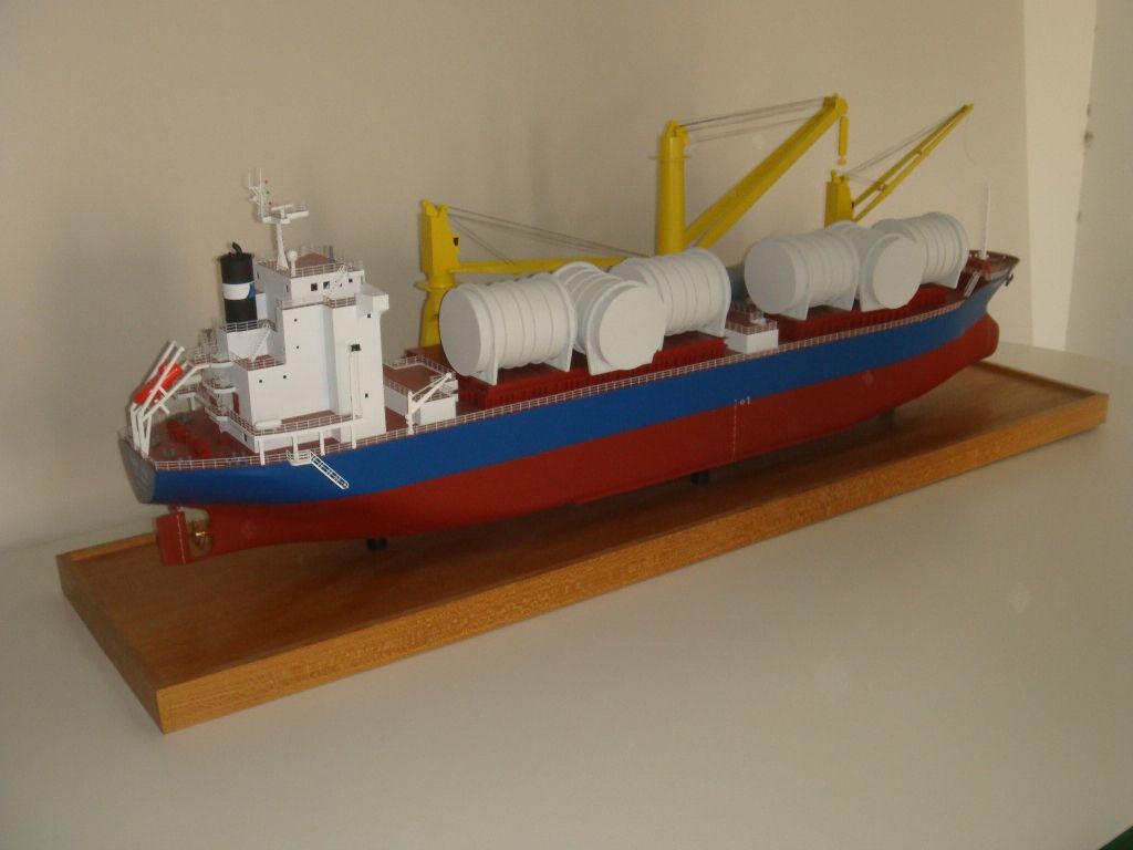 Measuring at 130 meters in length, 21.8 meters in breadth and a draft of 7.5 meters, this ship boasts a Gross tonnage of 9,373 MT and deadweight of 10,358 MT. The cargo holds are boxed with steel flooring. When handling cargo the ship uses two deck cranes, portside 40m and one jumbo crane 450m, which has a maximum speed of 13 knots.