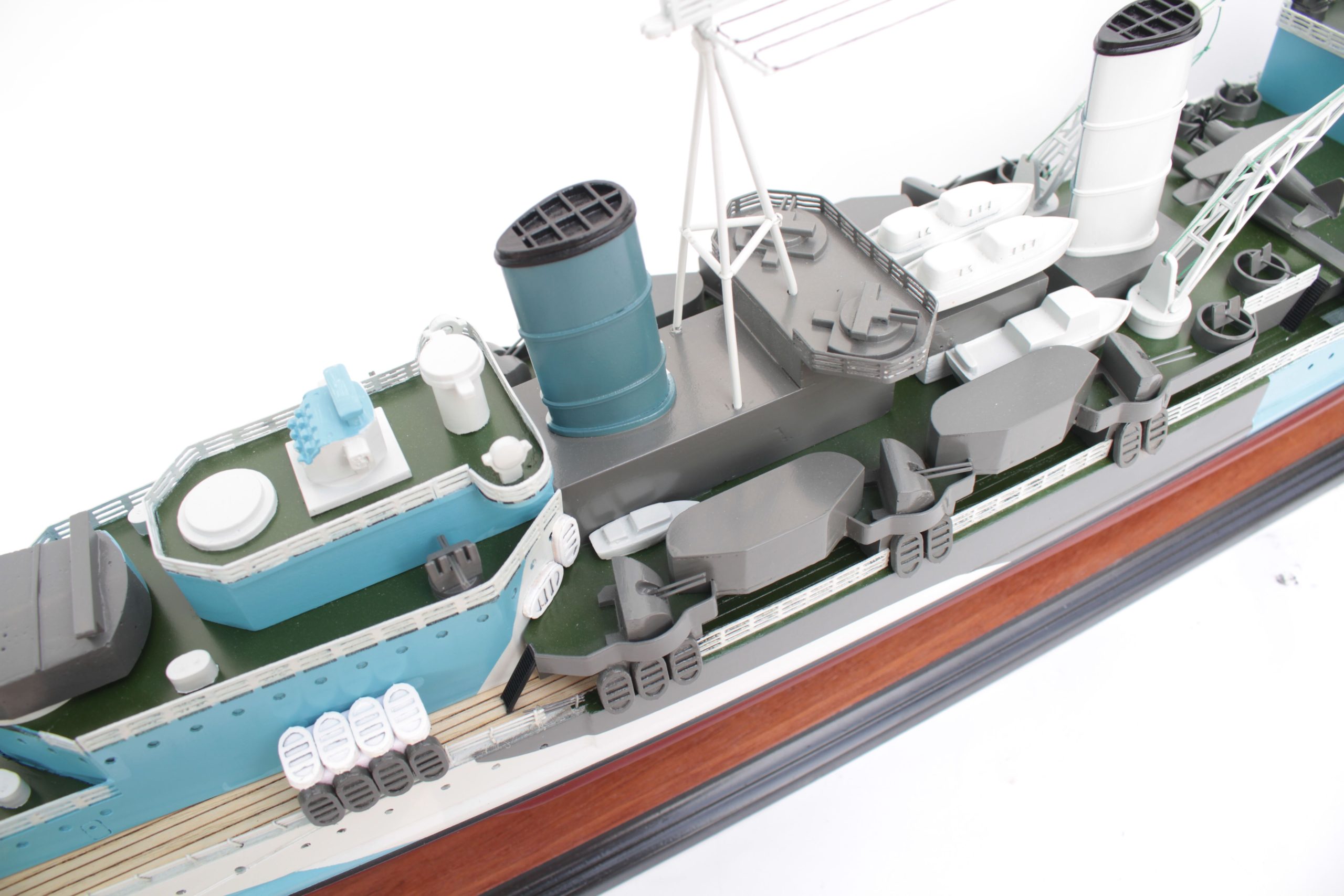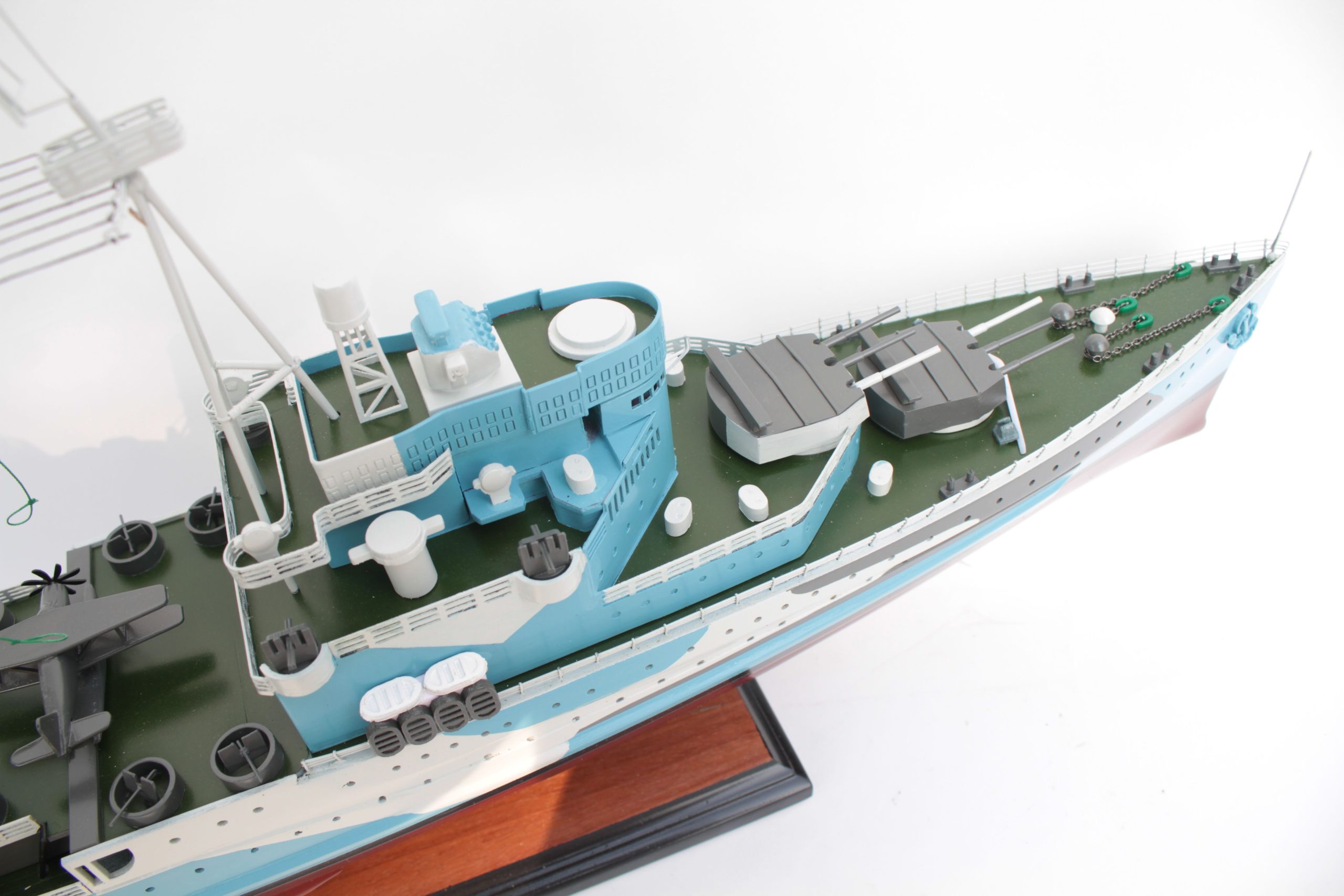 This model is not a kit and is ready for display. The model is mounted on a solid wooden base and includes a brass plate.