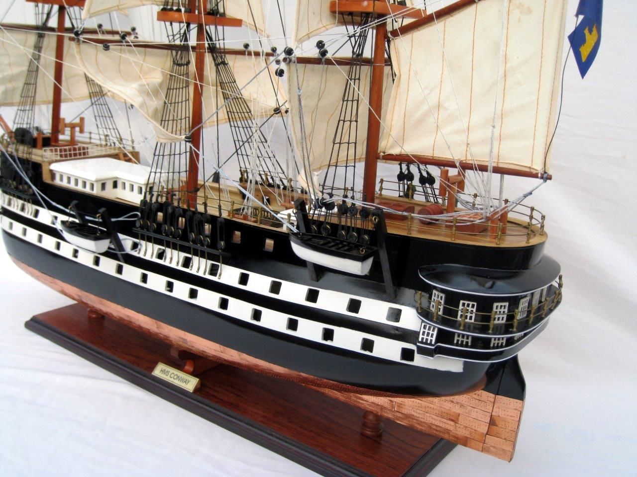 The HMS Conway Ship model is part of wide range of magnificent models from Ghia Nein offered at Premier Ship Models. Ghia Nein are renowned for their craftsmanship. An artisanal business with over twenty years experience, using locally sourced exotic woods and resources to produce exquisite hand crafted models. Based in Vietnam this family artisanal workshop ensures that each model is of high quality and are accurate replicas of original ships. Â Get this wonderful model of the HMS Conway Ship today, to sit proudly as feature in any room.