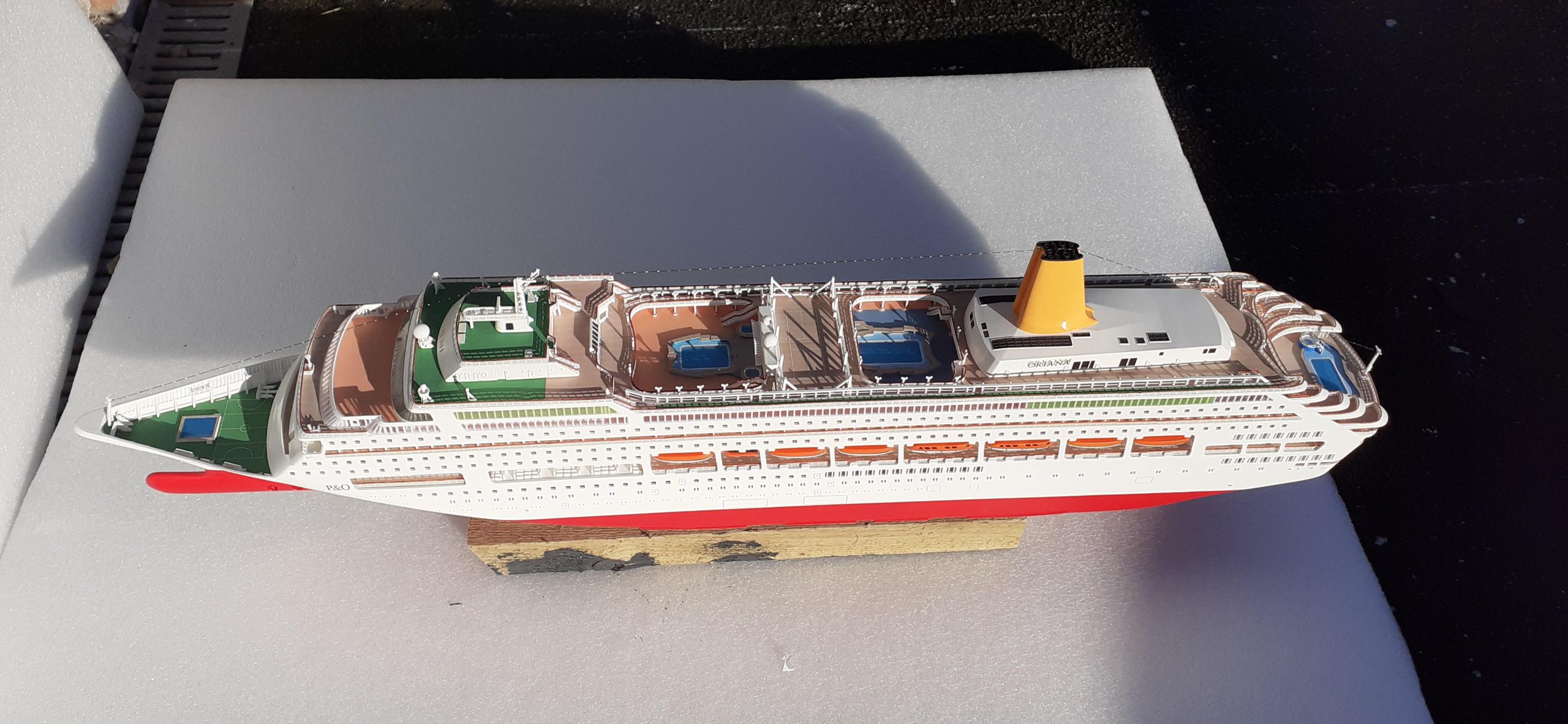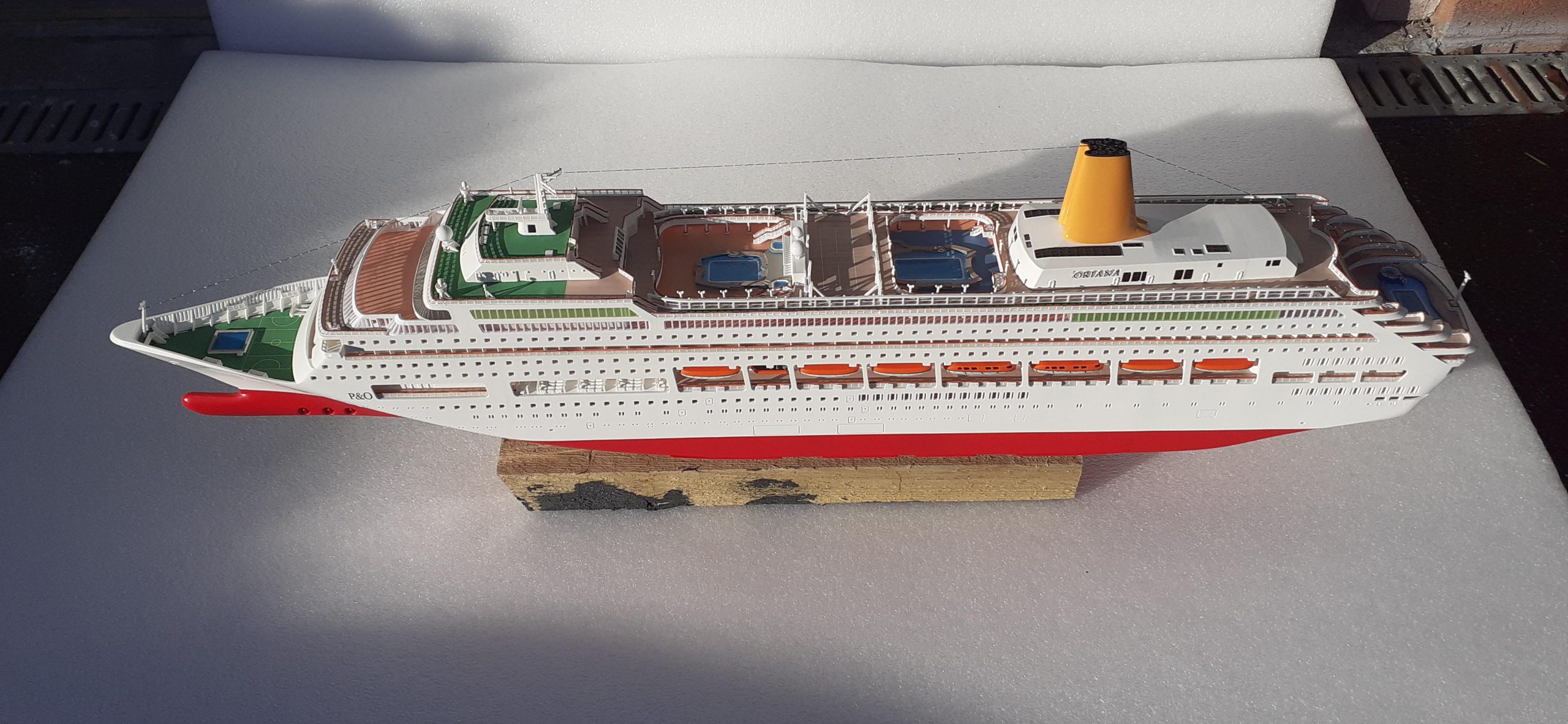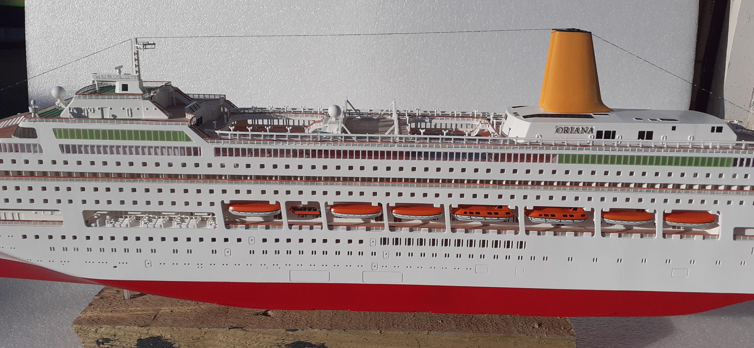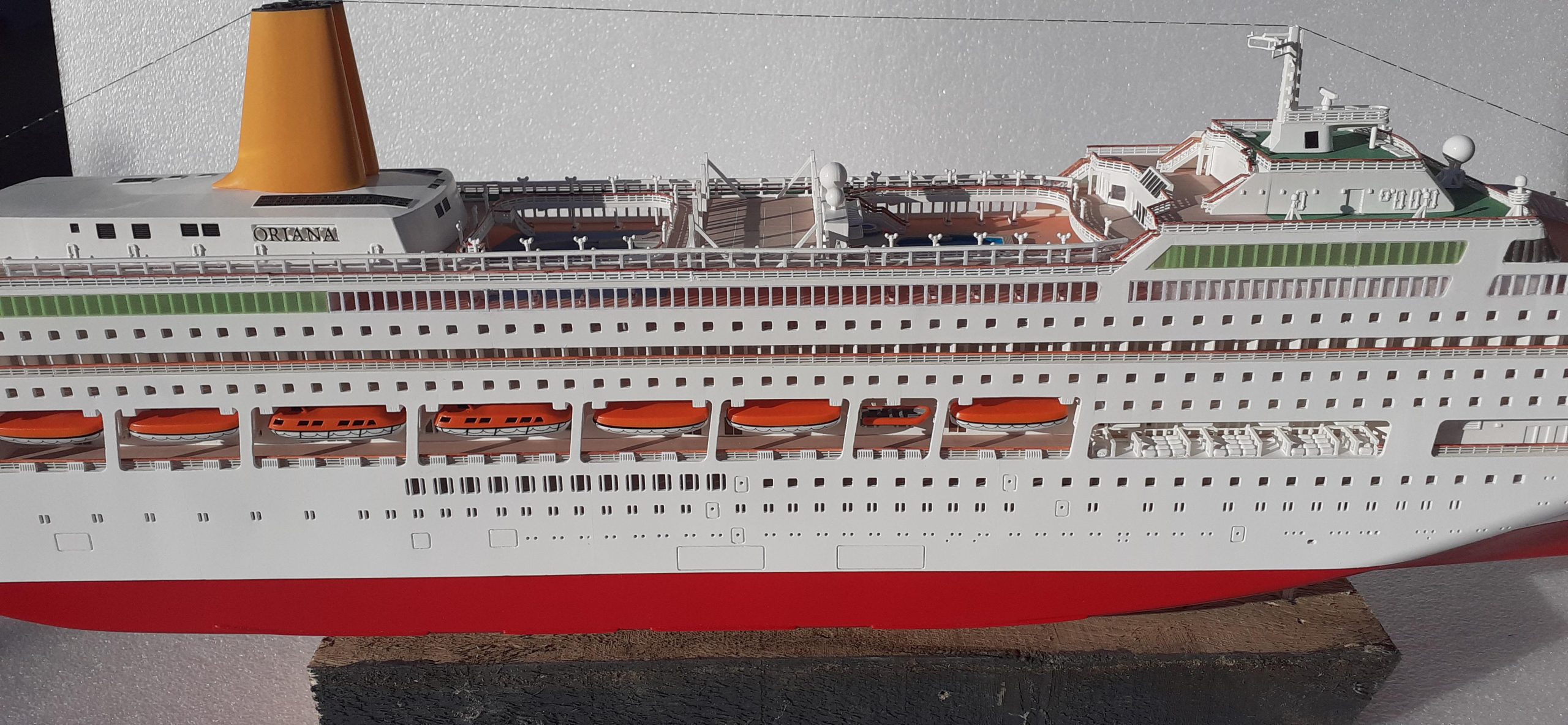 This impressive model spans 106 cm in length, 14 cm in width, and 31 cm in height, capturing the intricate details that make the Oriana a true gem for maritime enthusiasts. Ideal for those who appreciate classic liners, this model is a tribute to the elegance of mid-century ocean travel.