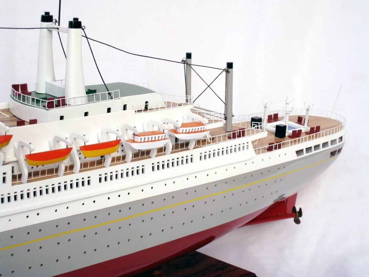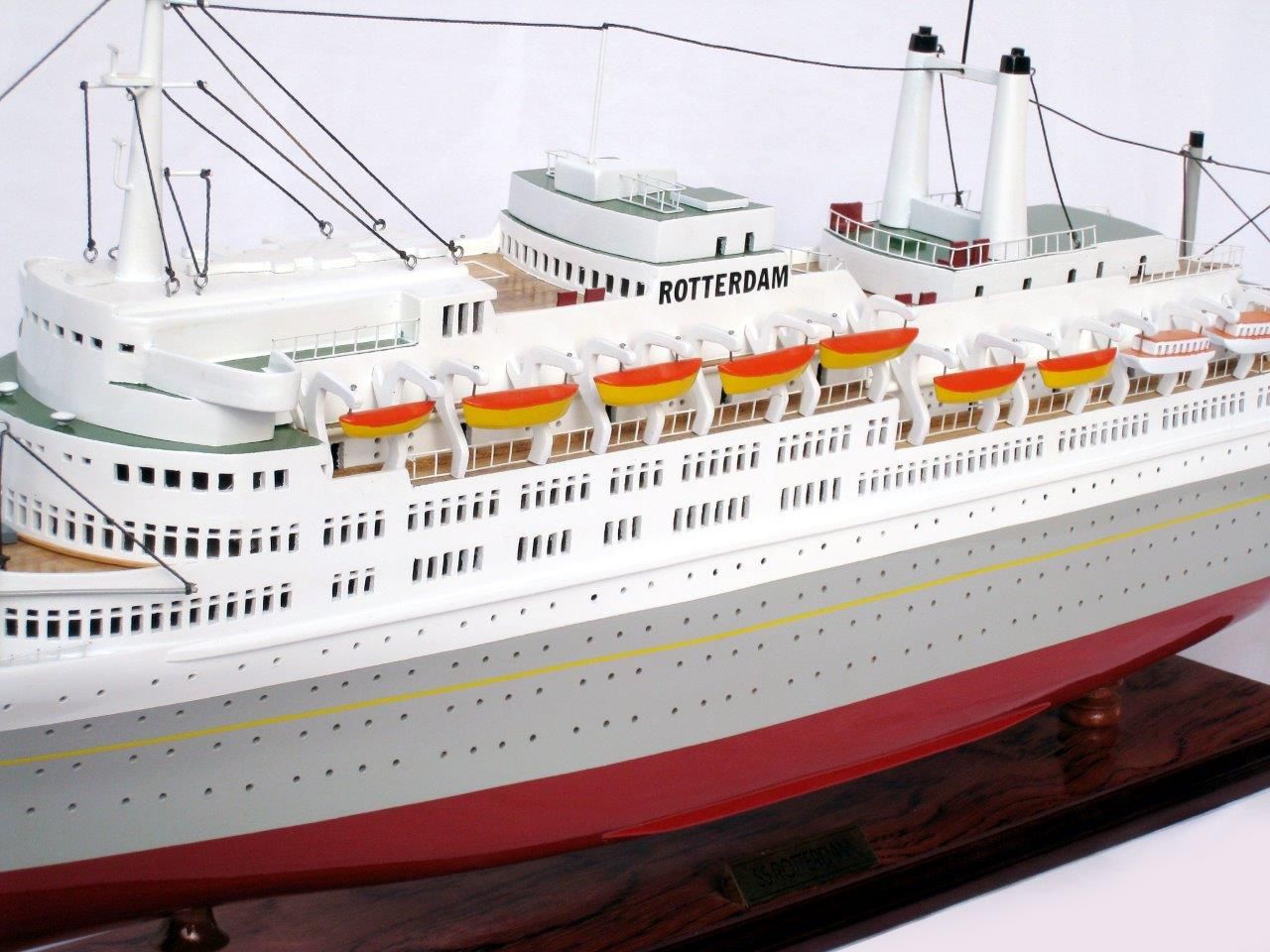 The SS Rotterdam Ship model is part of wide range of magnificent models from Ghia Nein offered at Premier Ship Models. Ghia Nein are renowned for their craftsmanship. An artisanal business with over twenty years experience, using locally sourced exotic woods and resources to produce exquisite hand crafted models. Based in Vietnam this family artisanal workshop ensures that each model is of high quality and are accurate replicas of original ships. Â Get this wonderful model of the SS Rotterdam Ship today, to sit proudly as feature in any room.