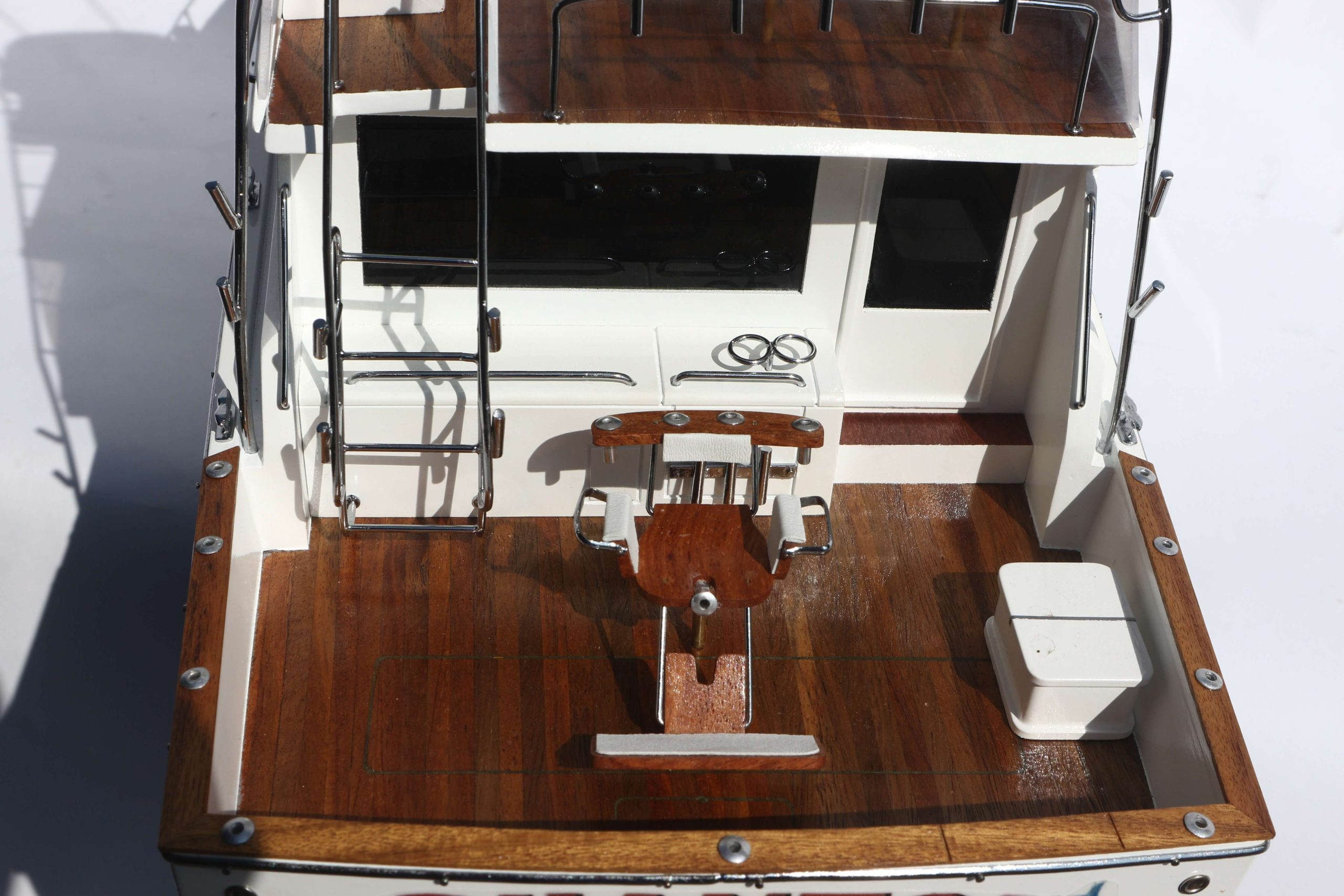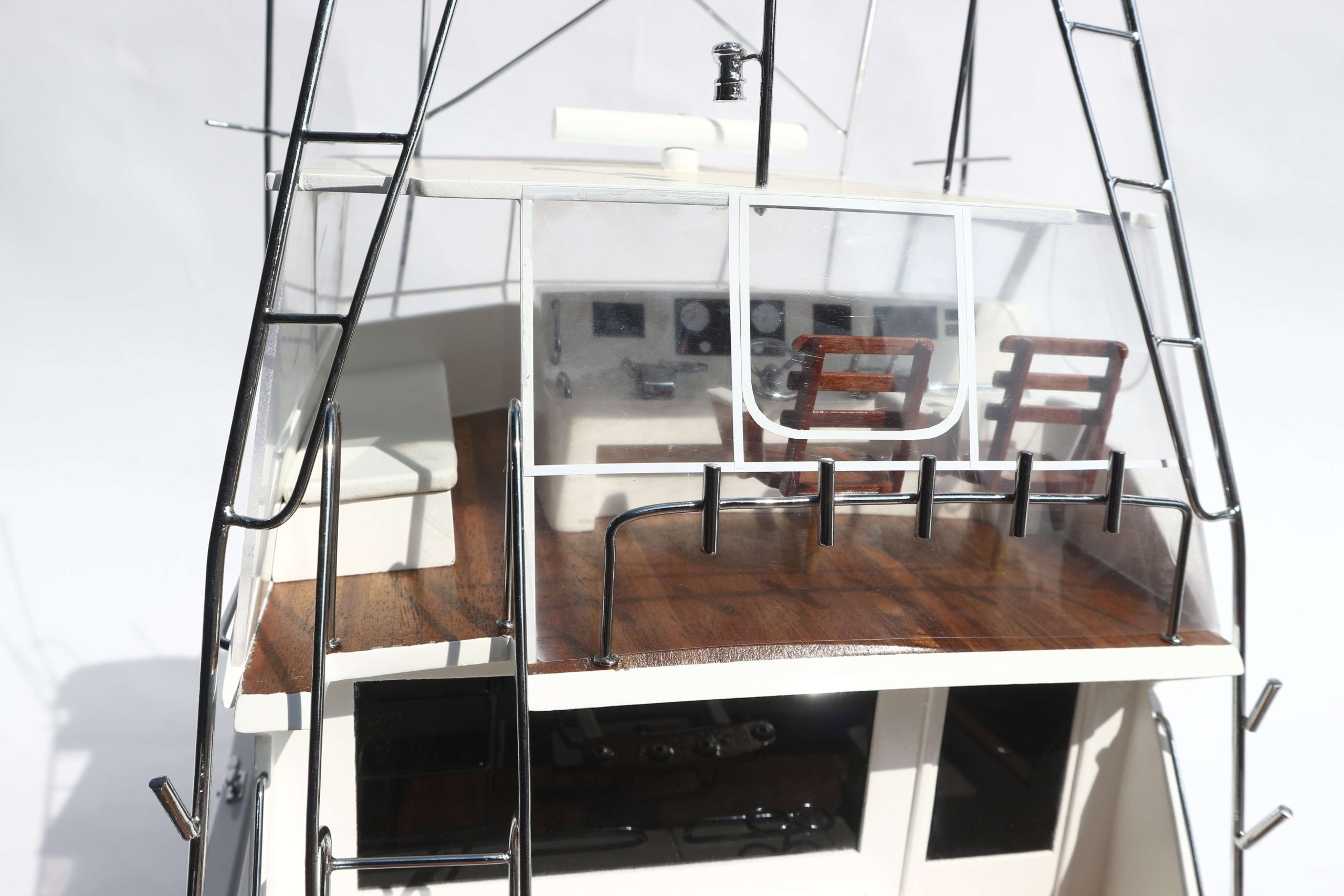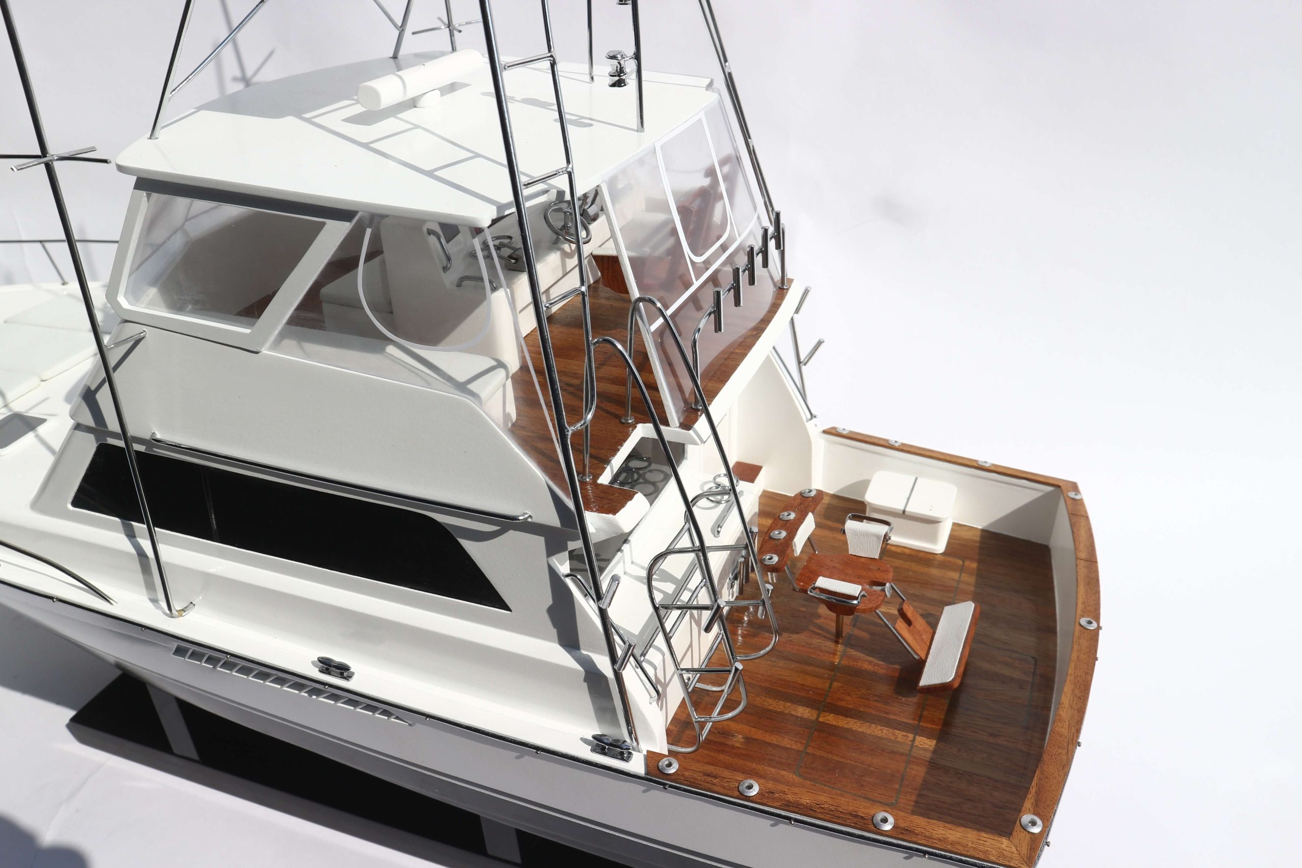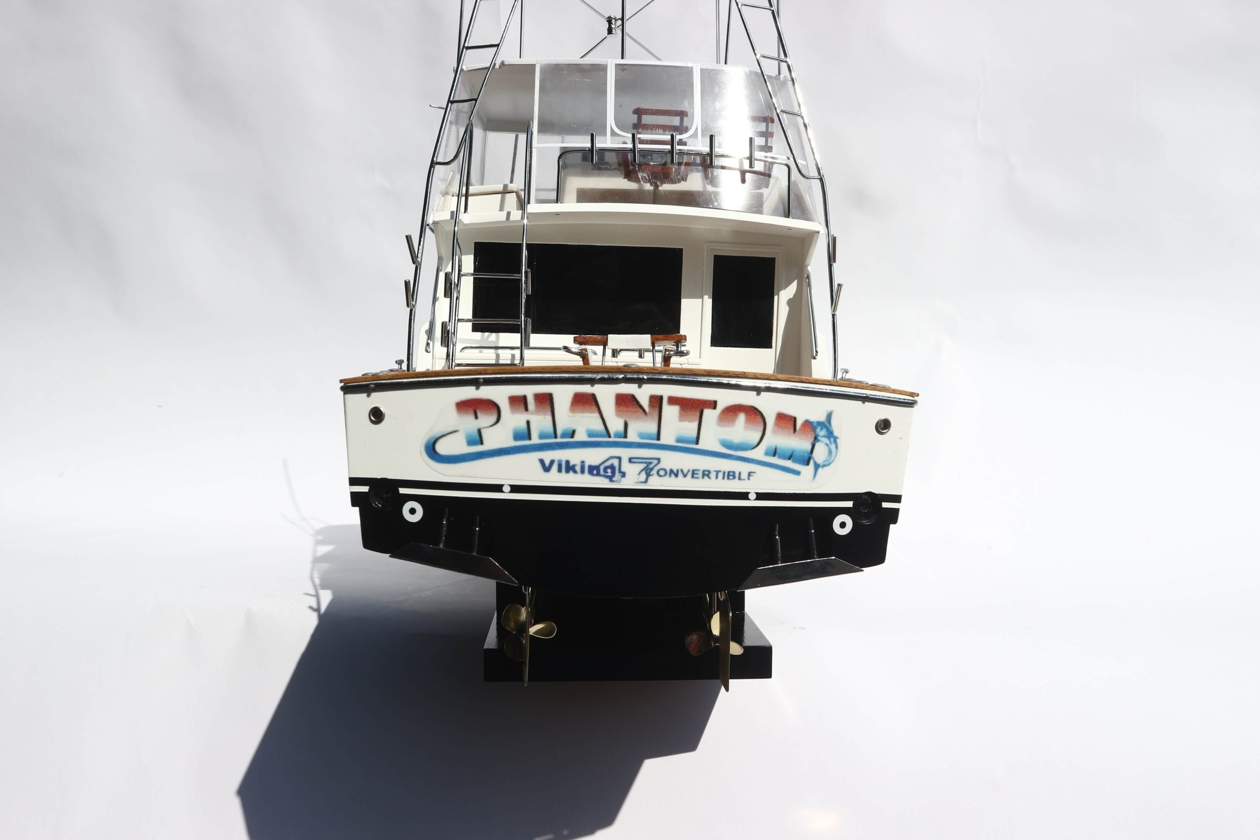 The Viking 47 is a luxury yacht with a cruising speed of 28 knots. Launched in 1997, this yacht was the prefect fishing boat. The Viking 47 is equipped with a salon, galley and Dinette and includes a roomy fishing cockpit with an in-floor fish box. About the Viking 47 model ship The Viking 47 ship model has been scratch-built by master craftsmen, using her original plan and photographs. This model requires hundreds of hours of work before completion and undergoes a stringent quality control process before leaving the workshop. The team of master craftsmen make use of their skills and expertise to build the hulls and bridges exclusively out of hand-picked hardwoods. Also used for building real-life ships, the construction method is known as the plank-on-frame technique, and takes years to master. In order to create a smooth finish, the model ship is sanded and varnished, before the painting begins. The details on this ship have been replicated using polished brass and metal finishes. The Viking 47 model ship would make an exquisite addition to any space. The model is mounted on a solid wooden base and includes a brass plate. This model is not a kit and is ready for display.